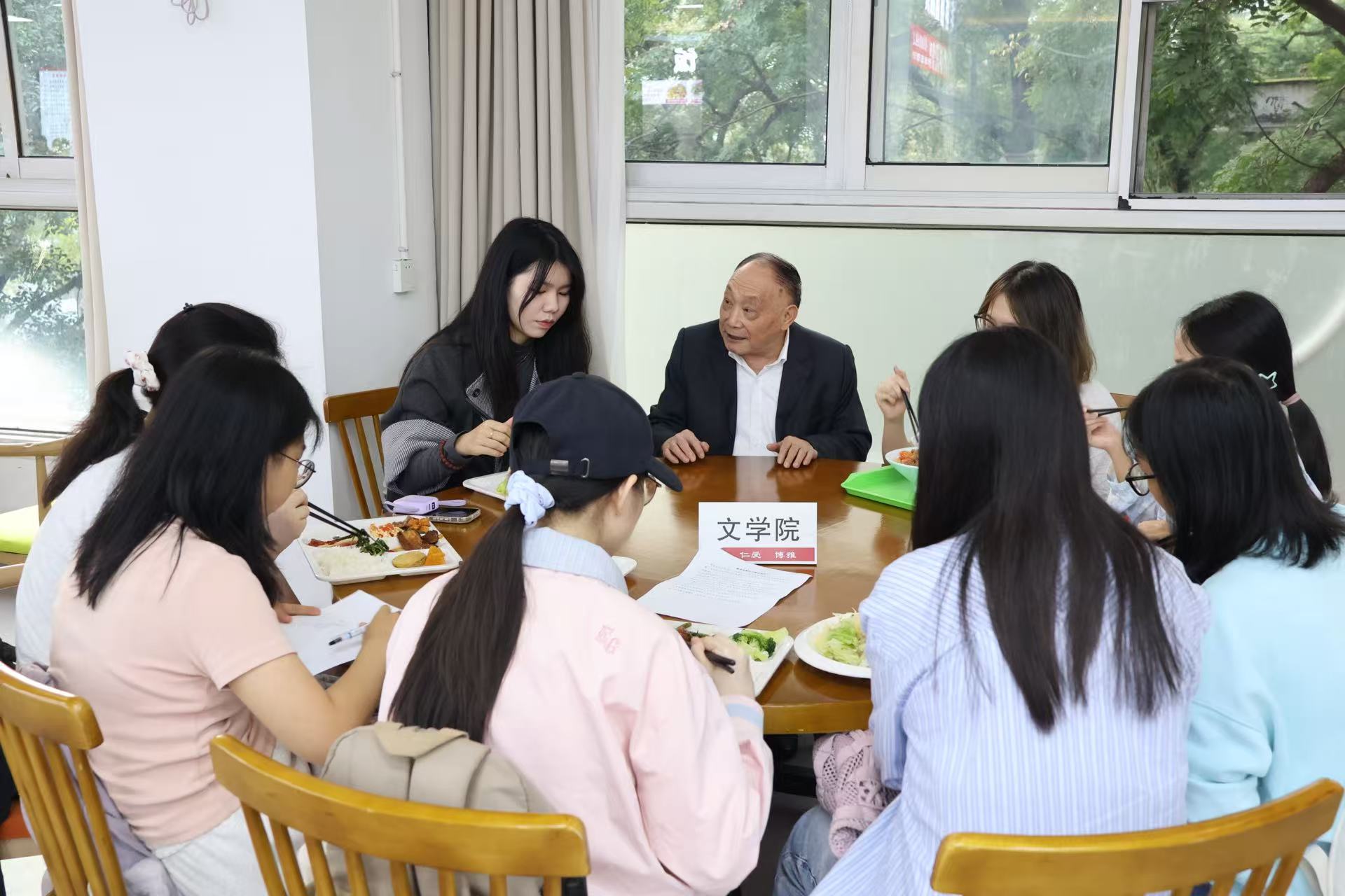10月16日,文学院举办2025年第十二次教授晚餐会暨第一期“前辈的火炬”师生交流活动。文学院退休教师孙永义老师受邀出席,与汉语言文学(师范)专业的7位同学围绕“师生共美食,情深话成长”的主题进行讨论。