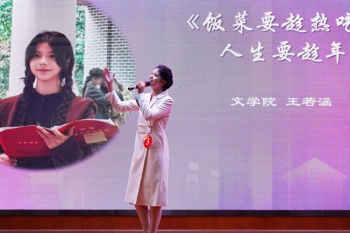 经学院前期选拔,汉语言文学(师范)专业王若涵代表文学院参加校级决赛。本次决赛以“春风化雨润桃李,言传身教育芳华”为主题,王若涵结合自身在文学院的求学经历,以《饭菜要趁热吃,人生要趁年轻闯》为题,用真挚语言讲述对“好老师”的理解——从课堂上的知识传授到课后的成长指引,从专业学习的答疑解惑到人生方向的指明点拨。最终,王若涵凭借出色表现荣获比赛一等奖。