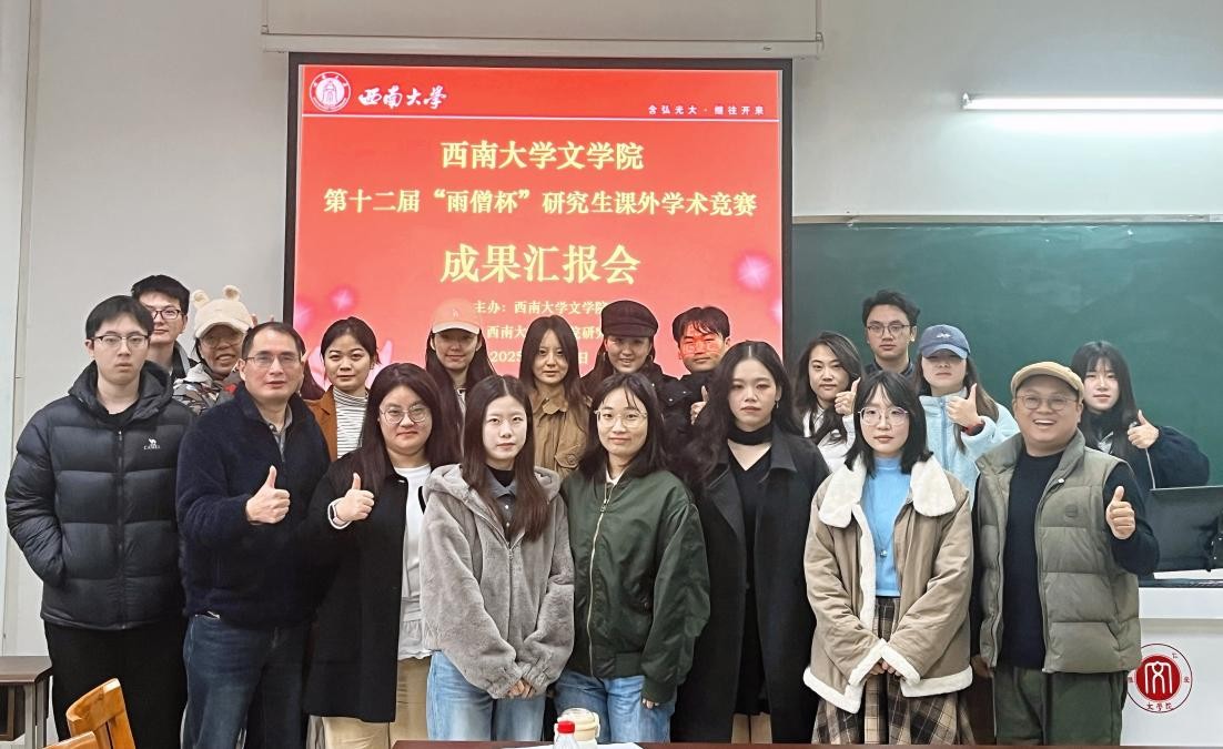 12月8日,第十二届“雨僧杯”研究生课外学术竞赛终审汇报会于文学院举行。艺术组在308教室开展,文学组和语言文字组分别在111教室及308教室开展。活动由文学院主办,文学院研究生会承办,旨在“培养学术精神、营造学术氛围”,通过征集研究生优秀学术成果、组织学院专家评审、集中指导修改、获奖作品结集编印、学术成果报告会、推荐发表等环节,促进研究生学术交流,提升研究生学术水平。本届“雨僧杯”共收到各专业学术论文投稿122篇,最终获奖22篇。其中,文学组13篇、语言文字组5篇、艺术组4篇。