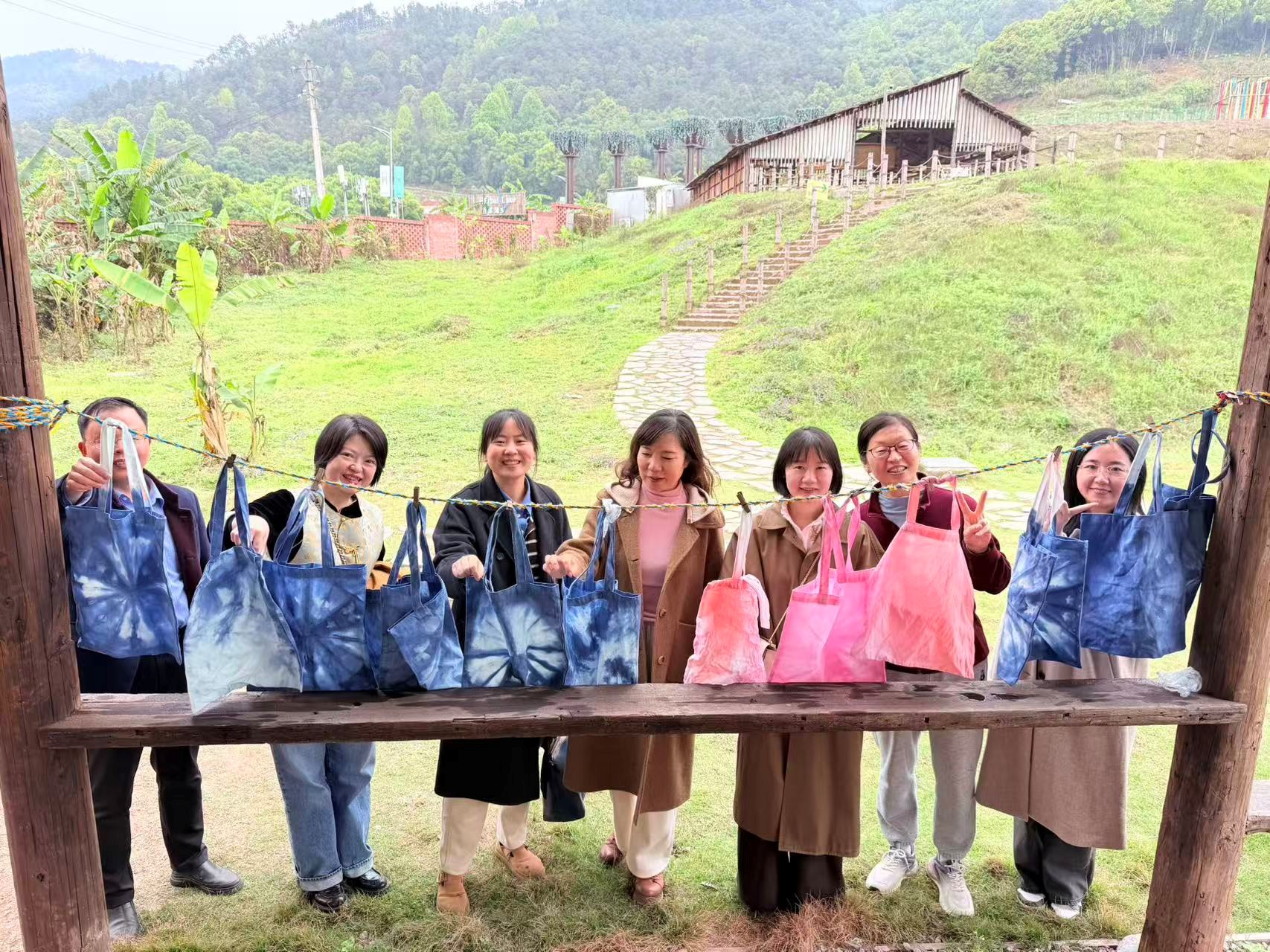 活动当日,天朗气清,绿意盎然。老师们暂别伏案工作,漫步于青山绿野之间,在清新的空气中舒展身心,在欢声笑语中交流互动。大家或驻足赏景,畅谈教学科研心得;或参与扎染体验,亲手将白布折叠、捆扎、浸染,在蓝白交织的纹样中感受民间手工艺的千年传承;或合影留念,定格春日美好瞬间。